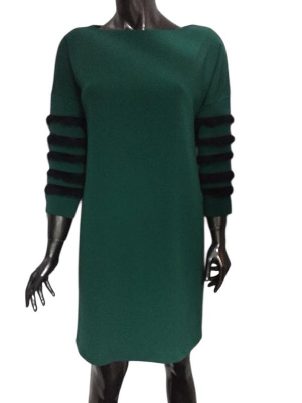 Елегантна жіноча сукня насиченого смарагдового відтінку. Модель прямого крою, з акуратним човниковим вирізом та оригінальними рукавами 3/4, декорованими контрастними темними смужками з хутра. Туреччина. Розмір 42 євро ОГ-49 см, тягнеться до 52, Об -51 см, тягнеться до 54, Довжина 91 см.