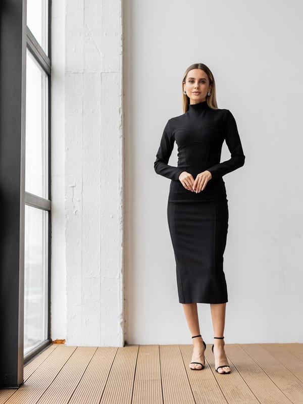 Очень красивое черная миди длинное вечернее платье по фигуре с корсетными контурами и разр...
