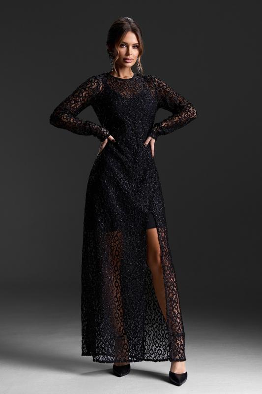 ‼️ТЕРМИН ОТПРАВКИ 2-5 РАБОЧЫХ ДНЕЙ!!️ФОТО РЕАЛ ‼️ Черное вечернее платье в максе длине с разрезом, выполненное из гипюра с люрексом. Модель прямого кроя с длинными прямыми рукавами и закрытой горловиной на пуговице. Под низом короткая комбинация. Размер: S, L, 2XL 15428