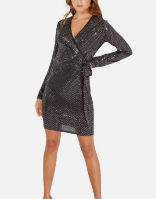 Очень красивое эффектное платье Мягкое и пластичное Размер L ( можно на М) Замеры : пог-46см, пот-37см, поб-49см, длина рукава -61см, длина платья-90см, хорошо тянется) Есть нюанс ( последние два фото) поотпадали блестки, можно переклеить сняв с длинного пояса От того цена минимальная!