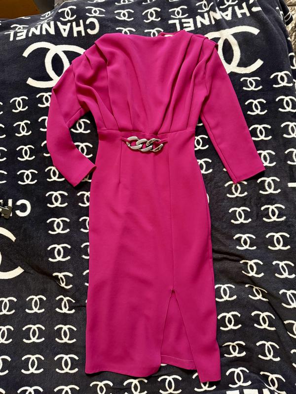 Плаття футляр гарного яскравого рожевого кольору фуксія Носила лише один раз Ззаду є замок Підкреслює вашу фігуру, є розріз на нозі Рукав три четверті Є також плечики Розмір 36 Маленький дефект є біля розпорки в розрізі ноги, але не видно, ціна відповідна Тканина щільна, на будь яке свято підійде!