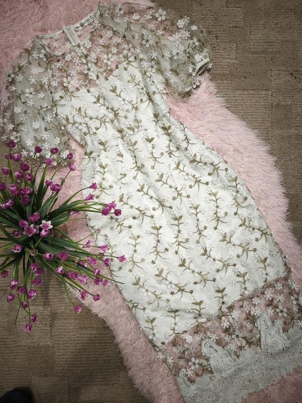 Невероятно красивое платье для праздничных церемоний, торжественных мероприятий, пошил по фигуре, ткань сетка с цветочной нашивкой и вышивкой золотом, низ прошва, до низа сужены, застежка на молнию сзади разрез, на подкладке, размер указан 14, замеры на фото