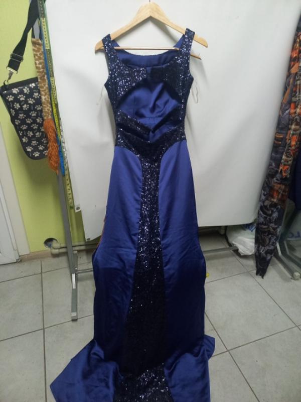 длинное нарядное вечернее платье,темно синие, украшенное пайетками,спина открытое,мещающее 2 лямки в пайеткепх,по юбку как перо расшито, удлиненная 160,груды 90,талия 66
