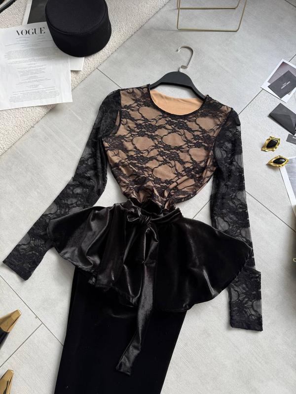 Женское праздничное платье с баской. бархат и гипюр. изумруд/мокко/черный. арт. g1462/0161