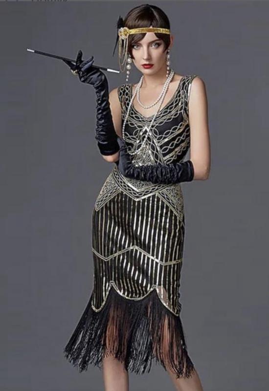Чорна сукня з бахромою та золотими пайєтками та бісером. Чудово підійде для вечірки у стилі 1920-х, Мафія чи Великий Гетсбі. Гарно лягає по фігурі. Розмір L-XL