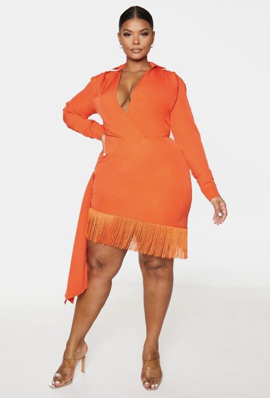 Стильна сукня насиченого помаранчевого кольору з глибоким V-вирізом і довгими рукавами. Ефектна бахрома додає руху та шарму, а комір з гострими краями створює виразний силует. Бренд: PRETTYLITTLETHING Розмір: UK 18 / EU 46 / US 14 / AUS 18 Матеріал: 90% поліестер, 10% еластан Особливості: драпіровка на плечах, бахрома, комір-стійка, еластична тканина Сукня ідеально підійде для вечірки, фотосесії або святкової події. Виглядає дорого та незабутньо — підкреслює індивідуальність і стиль.
