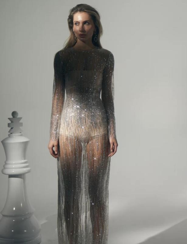 Ефектна сукня максі з сітчастого матеріалу із мерехтливим декором у блискітки від бренду Gepur. Розмір XS, одягалась один раз на виступ. Приталений крій з підкресленою талією та розрізом ззаду створює привабливий силует. Застібається на таємну блискавку в центральному шві спинки. Виріб прикрашений оригінальним напиленням, що створює ефект мерехтливого шлейфу Gepur: надлишки напилення трохи обсипаються, залишаючи за собою легкий зоряний слід. У комплекті йде топ-бандо та міні шорти нюдового відтінку. Сукня - ідеальний варіант на новорічний корпоратив)