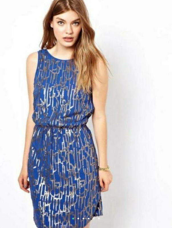 Дуже красива синя сукня на підкладці,ззаду відкрита спинка.Вся розшита золотистими паєтками.Не тягнеться.Груди 94,талія на резинці в не розтягнутому вигляді 66 см,тягнеться до 90 см,стегна 102,довжина 95 см