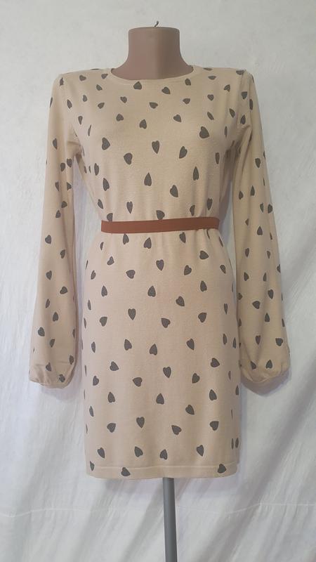Красива трикотажна сукня міні, може бути як туніка. Злегка приталена, до низу пряма. Гарно лягає по тілу. Матеріал тягнеться. Красиво зроблені рукава, до низу розширюються і закріплені на тонкій манжетці. Сердечка - сірого кольору. Матеріал -віскоза. Сукня без нюансів і пошкоджень. Розмір М., бірка зрізана. Орієнтуйтеся також по замірам Довжина =79 Пог=47 Пот=41 Поб =47 Довжина рукава =61 Обхват зап'ястя 18