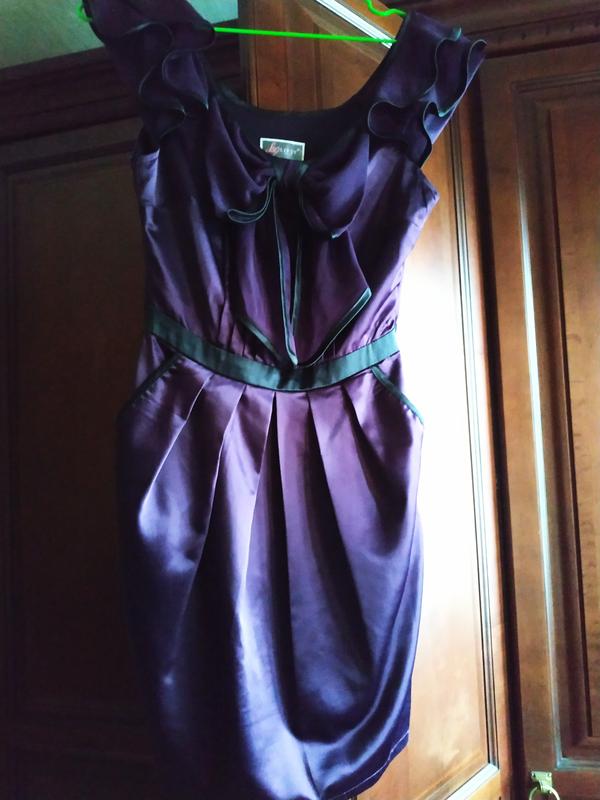 Очень красивое англ. бренда Lipsy London мини платье, атлас, впереди бант шифоновый,сбоку змейка.Цвет между баклажан и фиолетовым. Красиво садится по фигуре. Подойдет на худенькую-грудь до 88-89 см., талия до 70 см. невысокую девушку(до 165 см.) Состояние идеальное-одевалось 1 раз на праздник.