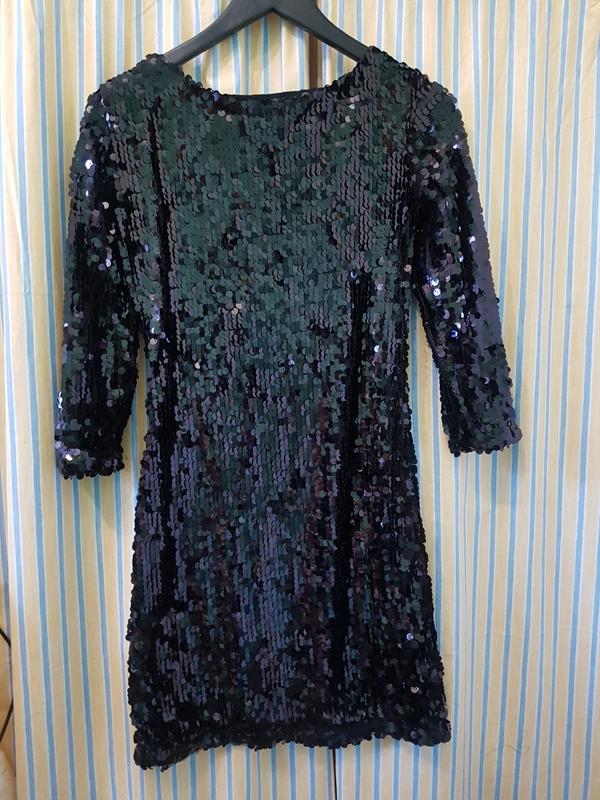 Платье из пайеток с гипюровой вставкой на спине. Выглядит шикарно😍 Размер M, длина платья 88см, длина рукава 47см. Одевалось пару раз. Без изъянов. Покупай платье и стань королевой вечера 👸 Возврата нет