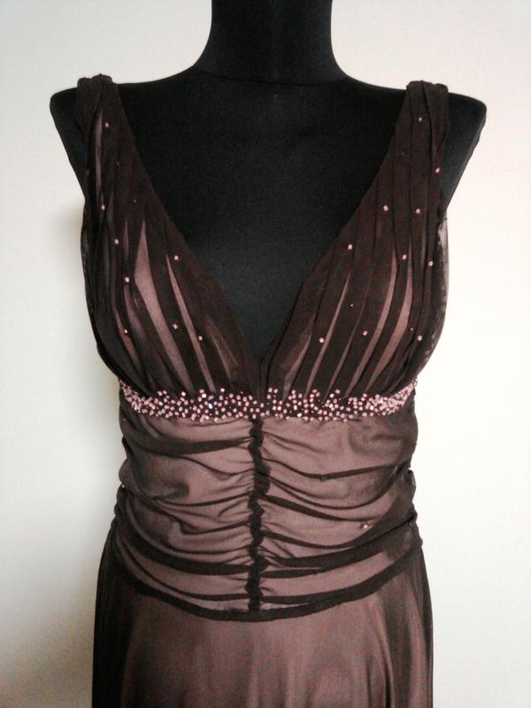 Ніжна сукня коричневого кольору, нижня юбка світло-розмова. Пог 37, талія 34см, довжина 120см, довжина спідниці 75см.