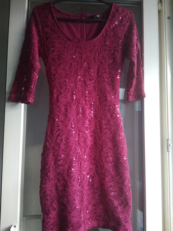 Новое!!!! Очень красивое, нарядное, кружевное платье Малинового цвета местами с паетками Рукава 3 /4 Сзади ДЕКОРАТИВНЫЙ замок Платье на подкладке, кроме рукавов СТРЕЙЧ