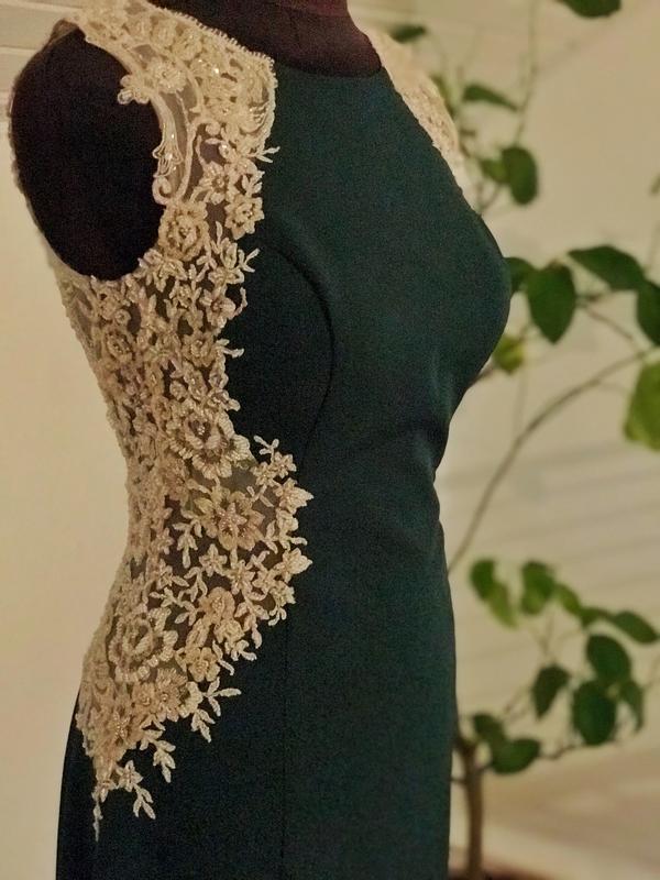 Вечірнє плаття , кольору хакі з відкритими руками та спиною, є чашечки для форми бюсту, , взаді є гачок і змійка. Плаття йде по фігурі . Вставки кружево. Торг присутній.