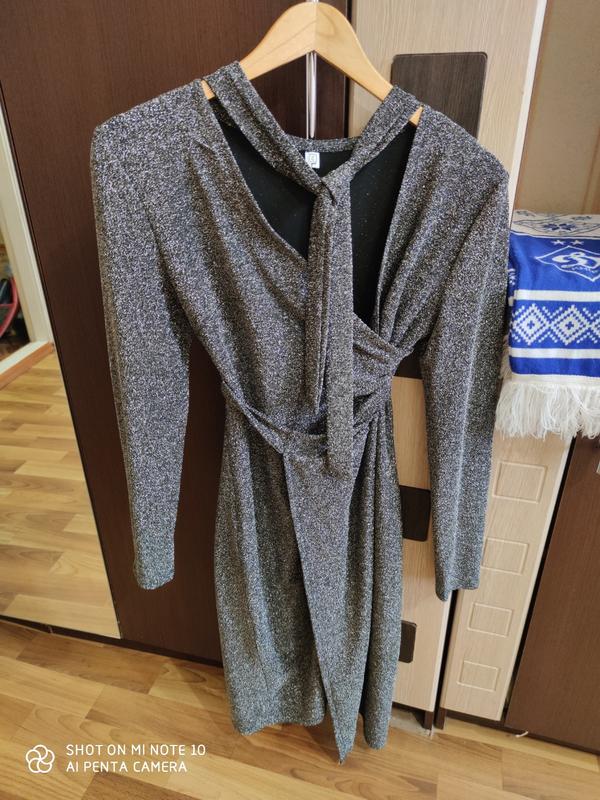 платье серого цвета с блёстками, с поясом, идеально сидит на фигуре