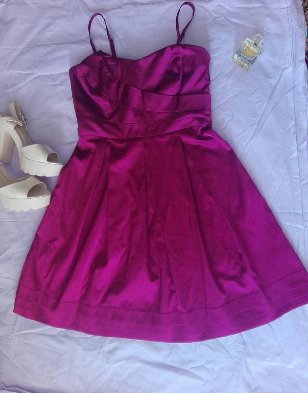 Сукня фіолетового кольору із плотної тканини, українського виробника, колір щось між темно малиновим і фіолетовим. Блисківка на спині, бретельки відчіпляються. Без дефектів куплялось для дружок але не підійшов розмір
