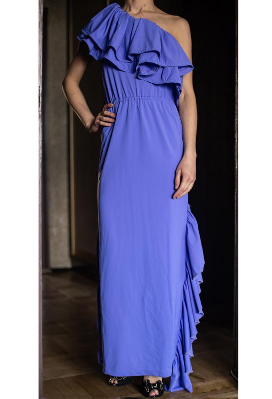 Сукня довга на одне плече гарного фіолетового кольору (на фото більш синій, в живу колір світліший і більш фіолетовий). Ручної роботи, шилась на замовлення. Вдягалась один раз, дефектів немає.