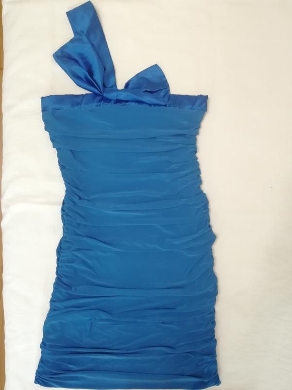 Вечернее платье с открытым плечами с лентой-бретелей на одно плечо. Есть пара маленьких затяжек, которые не видны в складах платья.