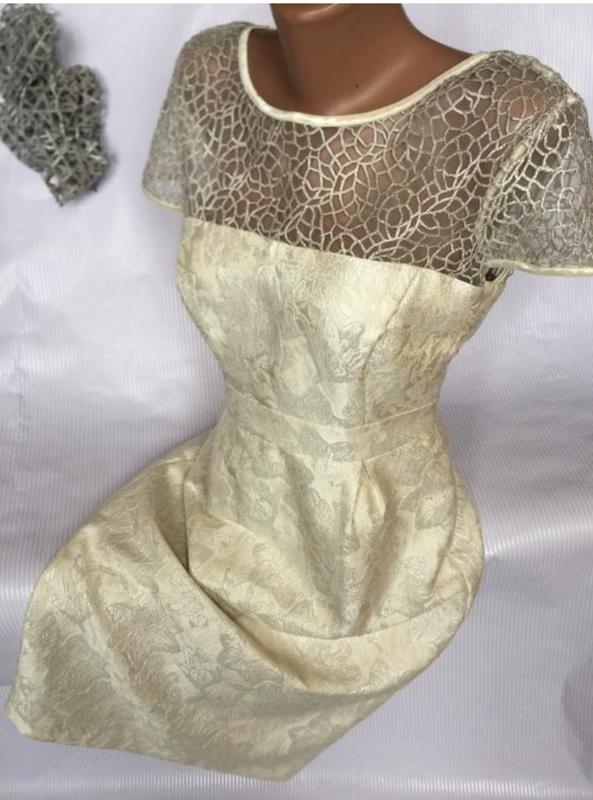 цвет молочно-бежевый, на подкладе. верх гипюр. сзади на молнии.шелк-жаккард. По параметрам на стандартный размер 14.