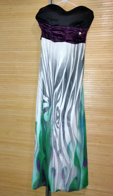 Вечернее легкое платье Подчеркивает бюст за счет легкого пуш-ап Практично универсальный размер за счет резинок в верхней части Стан идеален, единственный минус - зацепка снизу, которая незаметна, за счет пестрого рисунка и складок ткани Цена снижена для ремонта зацепки