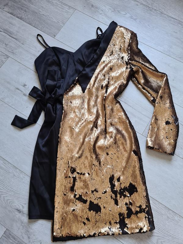 очень стильное платье-трансформер. состоит из базового платья-футляра и жакета из паеток на одну руку.
