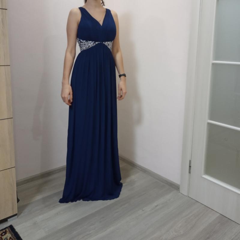 Вечернее платье насыщенного тёмно-синего цвета в пол. По талии и по спинке кружевные вставки. Спереди на груди поролон. Сверху по фигуре, к низу струится. Отличный вариант для корпоратива, выпускного или просто хорошего настроения. ПОГ 50 ПОТ 38 Длина от плеча 146