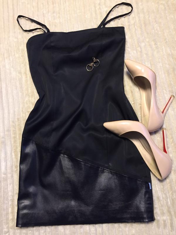 Очень стильное коктельное платье по фигуре на тонких бретелях и вставкой по низу из ткани, напоминающей мокрую кожу. Приталенный крой, длина мини, на качественной подкладке, в боковом шве вшит металлический логотип бренда. Состояние идеальнейшее! Фирменный знак итальянской компании Exte - идеальное сочетание противоположных цветов, форм и уникальный тандем классического и спортивного стилей. Главный потребитель марки - молодежь, самая сложная аудитория, отличающаяся переменами вкусов. В таком платье Вы однозначно привлечете к себе внимание))