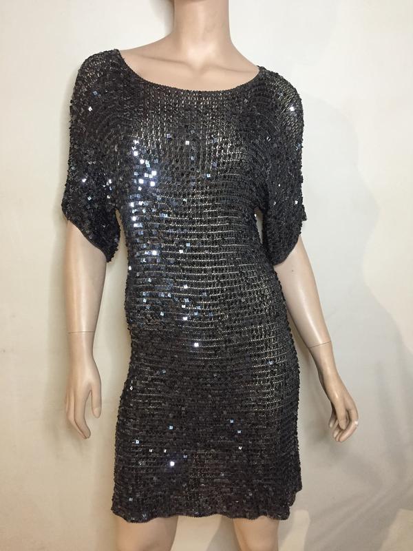 Вязаное платье,расшитое паетками.Можно носить как платье или как тунику.длина 93 см,рукав спущенный до локтя очень тянеться;можно на 48-50-52-54 размер.На 54 р. будет как туника