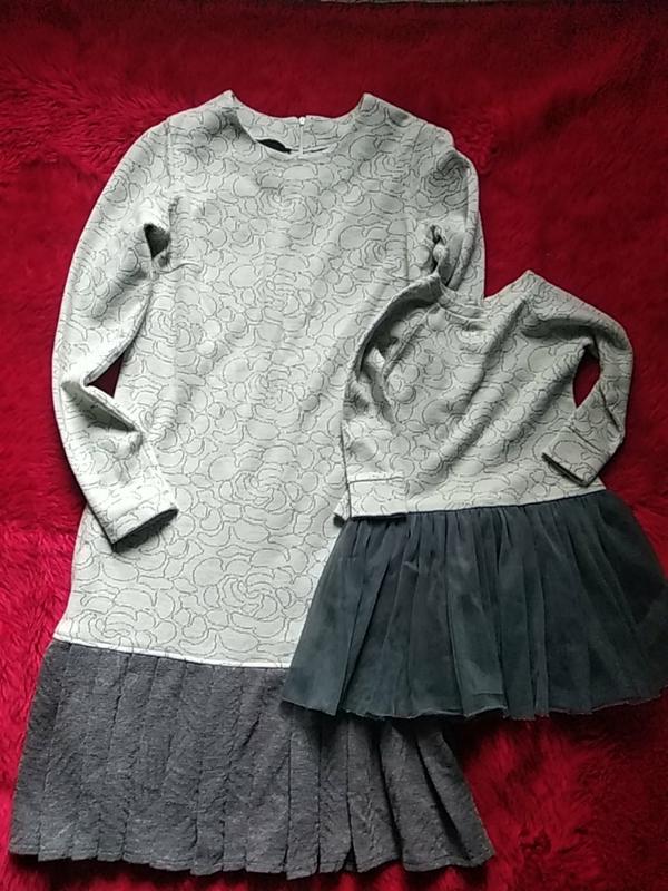 Плаття мами має довжину 92,рукав 58, груди 42.,пояс,бедра теж 42.Є 2 кармани, трішки тягнеться.На одному з фото видно плямку.Розмір42-44 Плаття доня довжина 50,рукав33.Тканина трішки тягнеться, розмір 92,98.На фото в дитини є теж пляма,і фатін з низу потрібно підрізати.