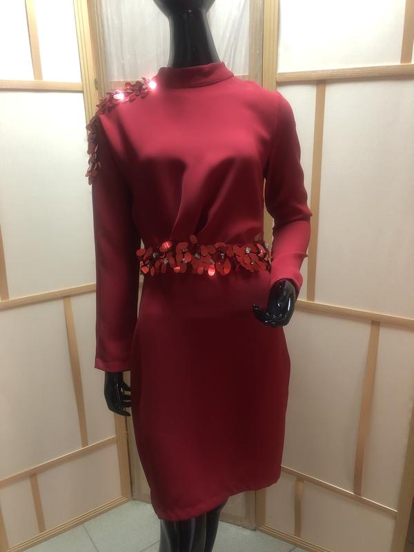 Платье производства Турция . Со вставками с камней и поедок , красного цвета , бок декорирован сеточкой . Европейский размер 36 , наш 44 р-р . Ткань плотная в меру , приятная на ощупь . 70 % вискозы , 3% лукры ,27 % полиэстр .