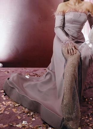Вишукана вечірня сукня з корсетом і відкритими плечами, та довгим рукавчиком, рукав оздоблений пір‘ям. Заміри Ог- 86 От- 67 Розріз оздоблений блискучою сіткою🤩 В ньому кожна дівчина відчує себе вишуканою леді💗