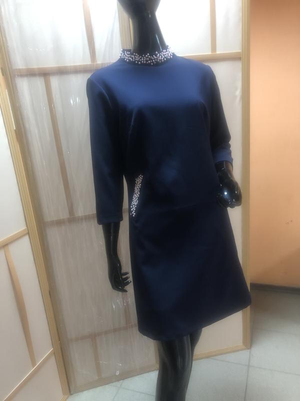 Платье синего цвета . По шее и карманчикам декор с бусинок и камушек . Размер 46-48 , европейский 40 р-р . Производство Турция . подойдет как на каждый день так и на выход .