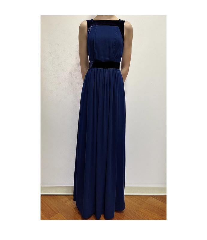 Очень красивое легкое платье глубокого синего цвета с отделкой из бархата, по груди плиссировка, на спинке скрытая молния Размер S Длинна 156 см, по груди 40 см, по талии 30 см