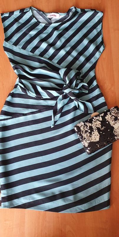 Гарна фірмова сукня,яка підкреслить вашу фігуру.Без рукавів.Збоку зав'язується на бантик,можна іншим способом зав'язати. Довжина 87 см.Пояс 37 см.В стегнах 46см.