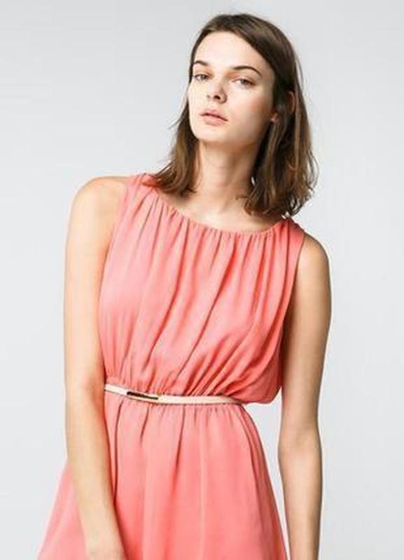 Плаття Mango світло-коралового кольору. Пошите з шифоновою тканини, на підкладці. Верх сукні присобраний, пояс на резинці. Розмір L. Підійде на М-L. Заміри: висота сукні 90 см, висота верху 41 см, висота нижньої частини 49 см, ПОГ 51 см, ПОТ 38 см. Сукня має пояс з металевою застібкою золотого кольору. Склад: 100% polyester.