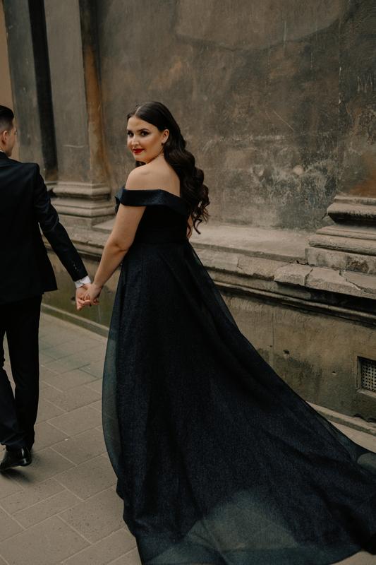 Чорна вечірня сукня. Має легкий шлейф. Практично не мнеться. Пояс регулюється. На фото ріст 175+підбори 10 см. (Нижню підкладку можна легко підрізати під свій ріст) Параметри: 100,80,110. Розмір м. Підійде на талію до 80 см. Одягалась один раз. Продаю після хімчистки.