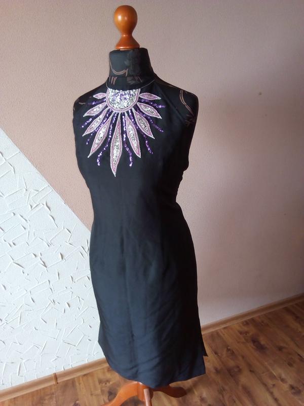 Приталенное на молнии .Спинка открыта.На завязочках.Лиф расшит разноцветными паетками..Полу об.груди—46см.Пол.об.талии—42см.Длинна—1м.Не тянется.100%SILK LINING 100%POLYESTER.