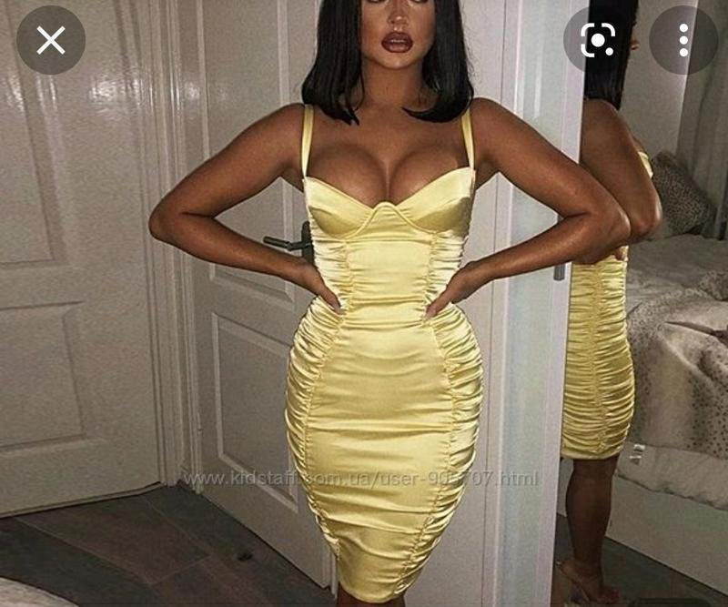 Очень красивое атласное платье желтого цвета, с чашечками, по бокам украшено сборочкой. Материал тянется. Платье абсолютно новое, но без бирки Размер 8. Полуобхват груди - 34 см. Полуобхват талии - 26 см. Полуобхват бедер - 39 см. Длина - 93 см.