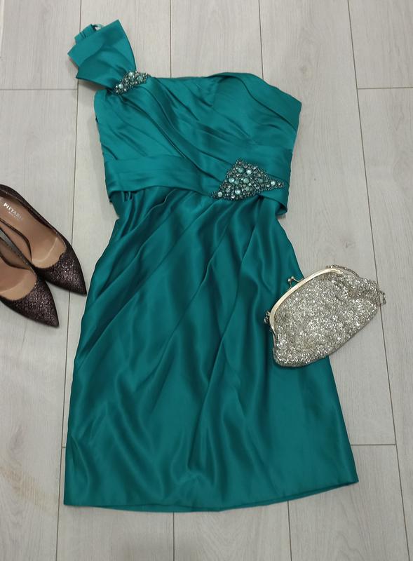 вечернее бирюзовое платье с драпировкой на 1 плечо с вставками из камней