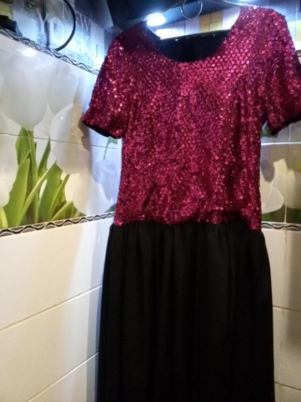 Ззаду воно довше, аніж з переду. Має підклад.Етикеток немає ніяких. Є місця де відстоїлися блискітки, це по шву. Пог 50, пот 50, поб 114, довжина з переду 111 , ззаду 132.