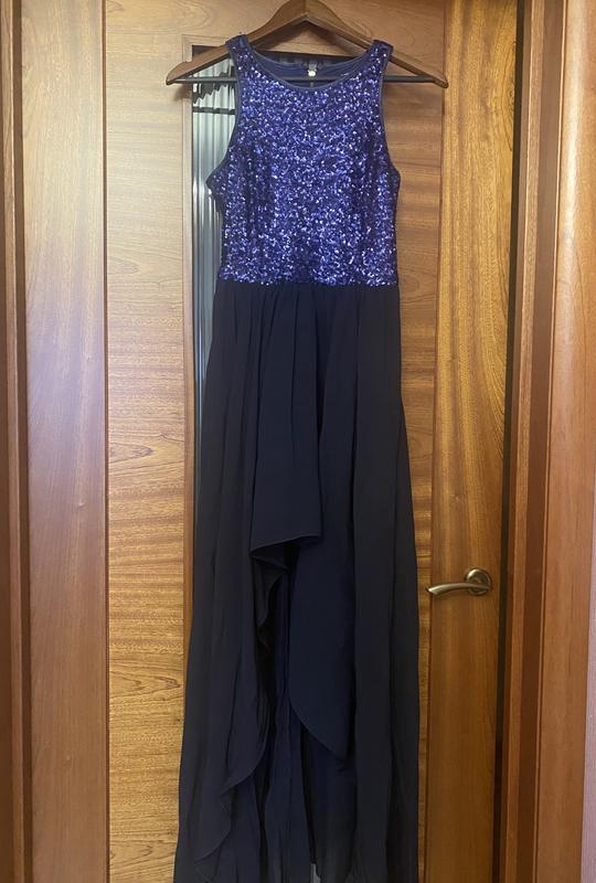 Вечернее/коктейльное платье в пол, ассиметричная юбка, спереди до колен. Часть платья в пайетках, застёгивается на молнию. Надевалось один раз на Новый год.