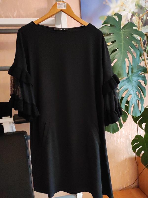 Дуже ошатне маленьке чорне плаття, красиве декорування, ажурний рукав сітка і в'язаний трикотаж, маленькі кишеньки, не важкий, на наш розмір 46