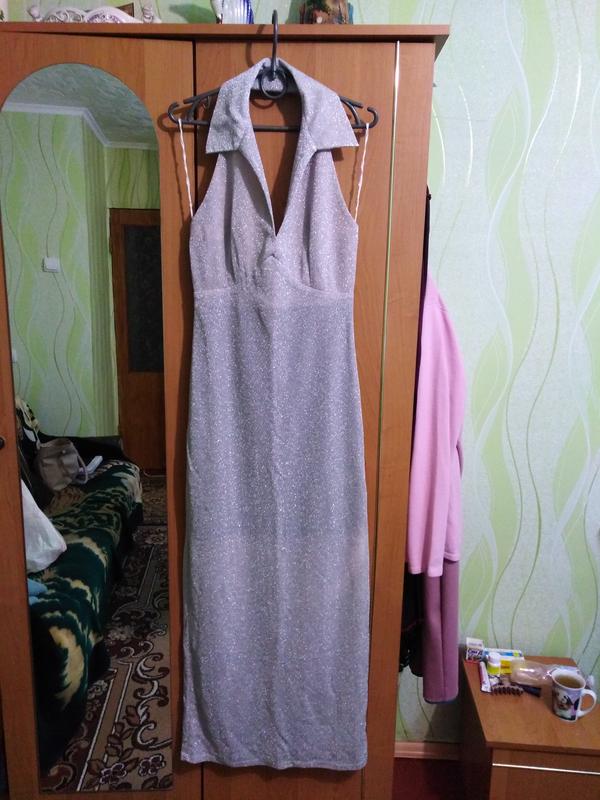 Розмір М, колір срібло, довжина 150, ПОГ 35, Піт 40, Побіди 45, попереду трикутний виріз, а ззаду відкрита спина. Через шию комір. Спідниця міні.