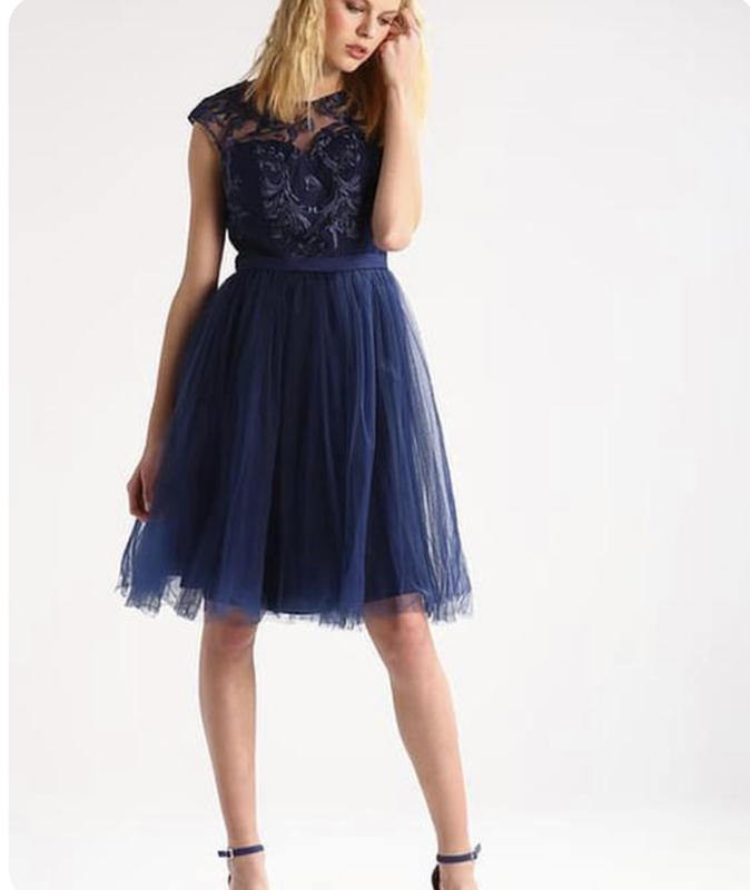 Чарівна, вишукана сукня темно-синього кольору. Верхня частина сукні виготовлена з дорогого гепюра, нижня спідниця з фатіна. Застібка по спинці складається з маленьких гудзиків. Розмір м