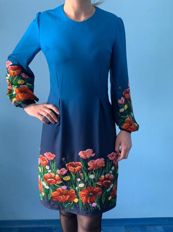 Сукня вишита бісером. Нова. На спині має прихований замочок. На сукню пришито 40тис.600 бісеринок. Підійде на ріст 1,63м-1,65м. ОТ - 65-66см ОГ - 86-87см ОБ - 92см Рукав - 57см Довжина сукні - 88см Манжет - 17см
