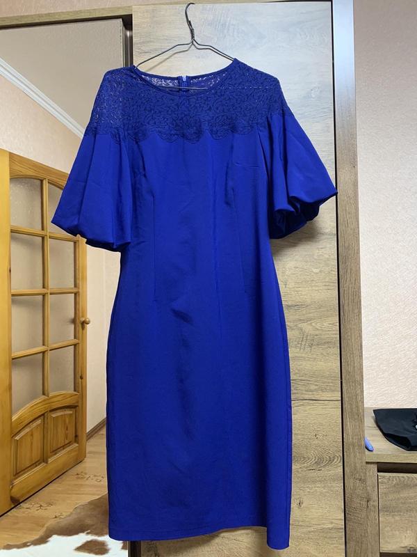 Сукня синього кольору, розмір 2xl але по фоктку менший, пів обхват грудей 50см, довжина виробу 110см , рукав фонариком. верх із ажурної сіточки. Одягалося один раз на один вечір.