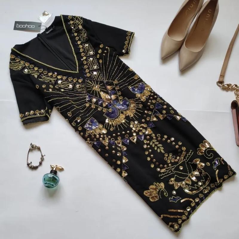 Платье Boohoo. Размер указан 16. ПОГ - 53-53,5, ПОТ - 52, ПОБ - 57. Длина 86. На подкладке. Сзади вышивки нет. 100% полиэстер