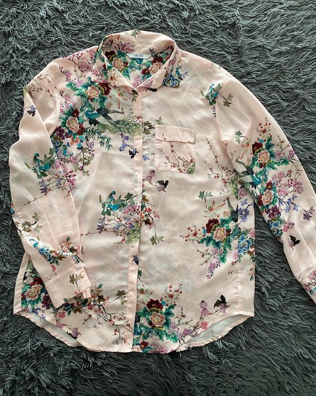 Шовкова блуза родева в принт райських птахів.ПОГ-50см, ПОТ-50см.Довжина 71см