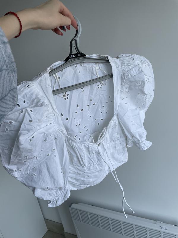Топ із прорізною вишивкою в тон, V-подібним вирізом і короткими рукавами-ліхтариками. Застібається на приховану блискавку збоку. Зав’язки на грудях, резинка внизу на рукавах і жата еластична тканина ззаду. Білий | 0881/023 | JOIN LIFE Повністю новий з біркою.