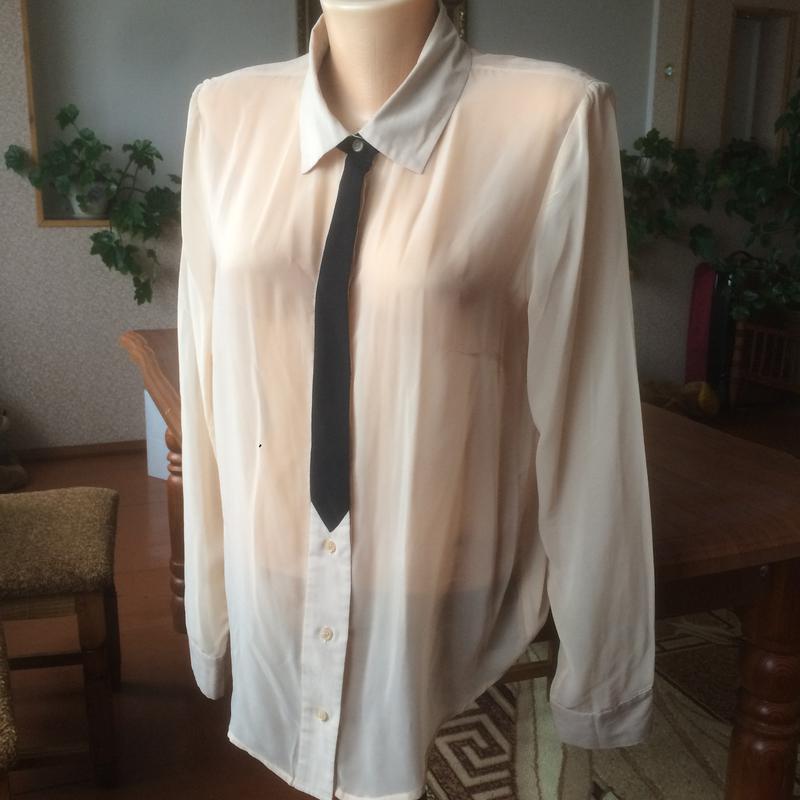 Легкая полупрозрачная бежевая блуза с имитацией галстука. Размер 14-16 . Отлично смотрится под чёрным пиджаком (который найдёте в других моих объявлениях) .Могу сделать дополнительные замеры. Спрашивайте